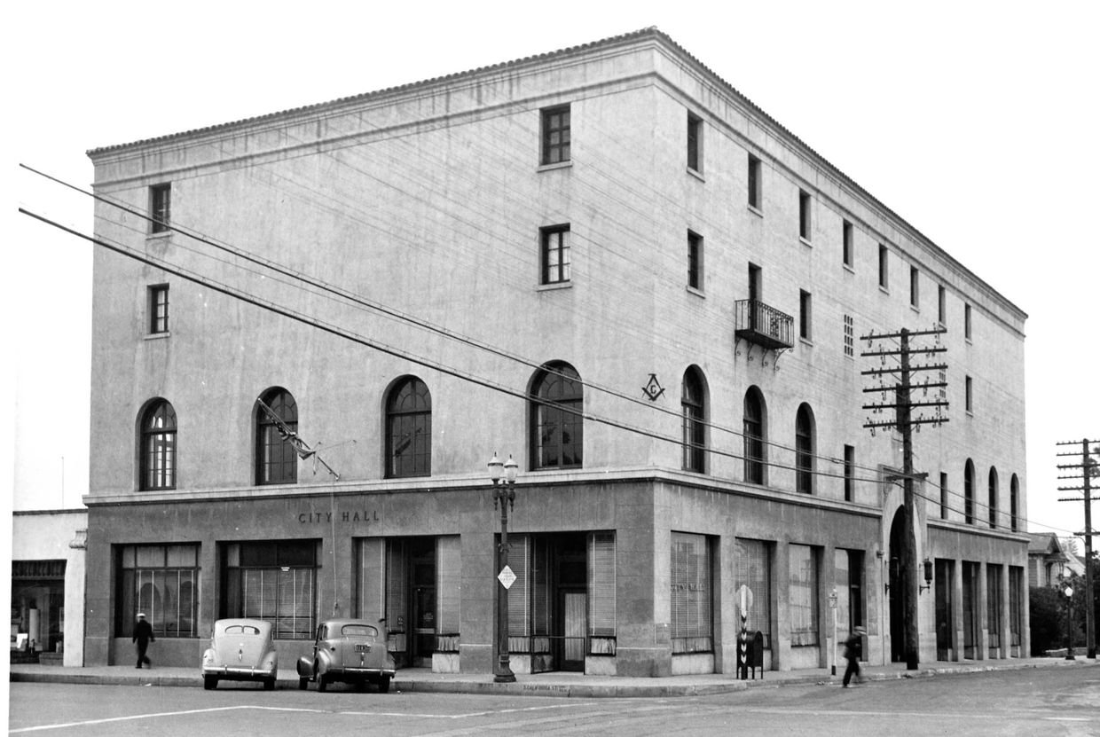 One of the tallest buildings in downtown Ventura with significant architectural and social character, the Masonic Temple is now used to house the Ventura Visitor’s and Convention Bureau. Large arched windows, high ceilings with painted beams, and extensive use of well-maintained wood exemplify the architectural style of the late 1920s. In the 1940s City Hall was housed on the first floor of the building as seen in this photo.